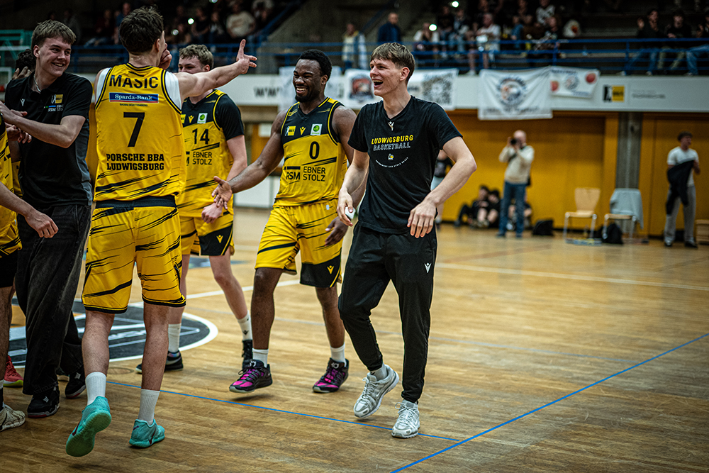 Ein gelber Konfetti-Regen von der Tribüne, auf und abseits des Parketts endlos glückliche Schwaben, begeisterte Feierlichkeiten im Nachgang begleiten im Dreiklang sowie in Perfektion den Wochenendstart im Ludwigsburger Basketball. Der Seriensieg – per 2:0-Sweep – der fünftplatzierten Porsche Basketball-Akademie gegen die viertplatzierten Itzehoe Eagles ist dabei wahrlich keine Sensation, mit Sicherheit aber in der Art und Weise eine (weitere) Positiv-Überraschung. Denn das zweitjüngste Team der Liga überzeugt(e) auch im zweiten Spiel der Achtelfinale-Serie auf ganzer Länge. Die Tatsache, dass diesmal andere Faktoren als in der Vorwoche den Ausschlag gaben, spricht dabei für die Ludwigsburger Qualitäten, die analysierten, adaptierten, siegten. Dies war auch notwendig. Denn nach einem gelb-schwarzen Offensivfeuerwerk im ersten Duell (78:90) samt zahlreicher Punkte innerhalb der Zone und 40 verursachten Freiwürfen veränderten die Schleswig-Holsteiner ihre Herangehensweise im zweiten Spiel grundlegend.